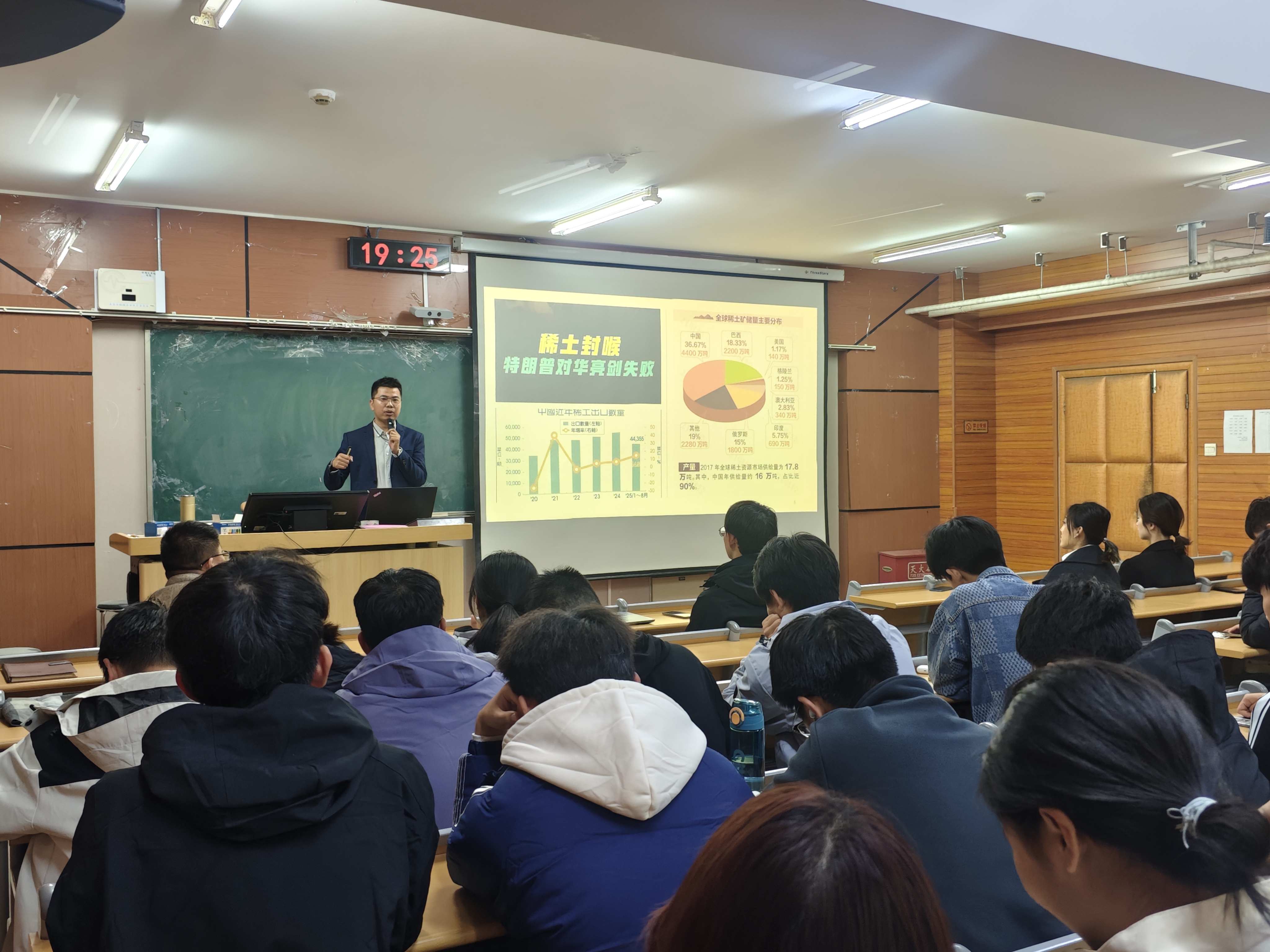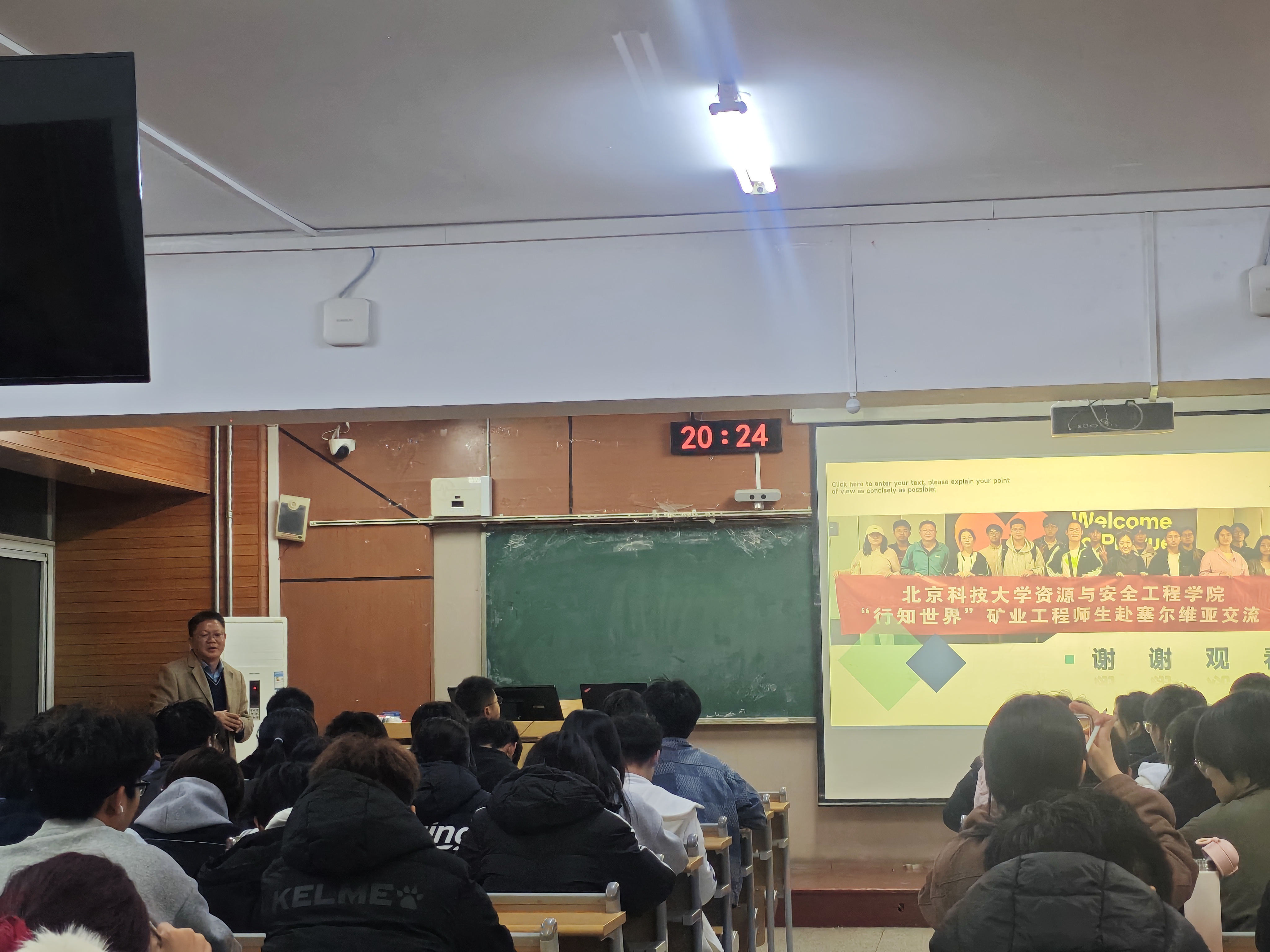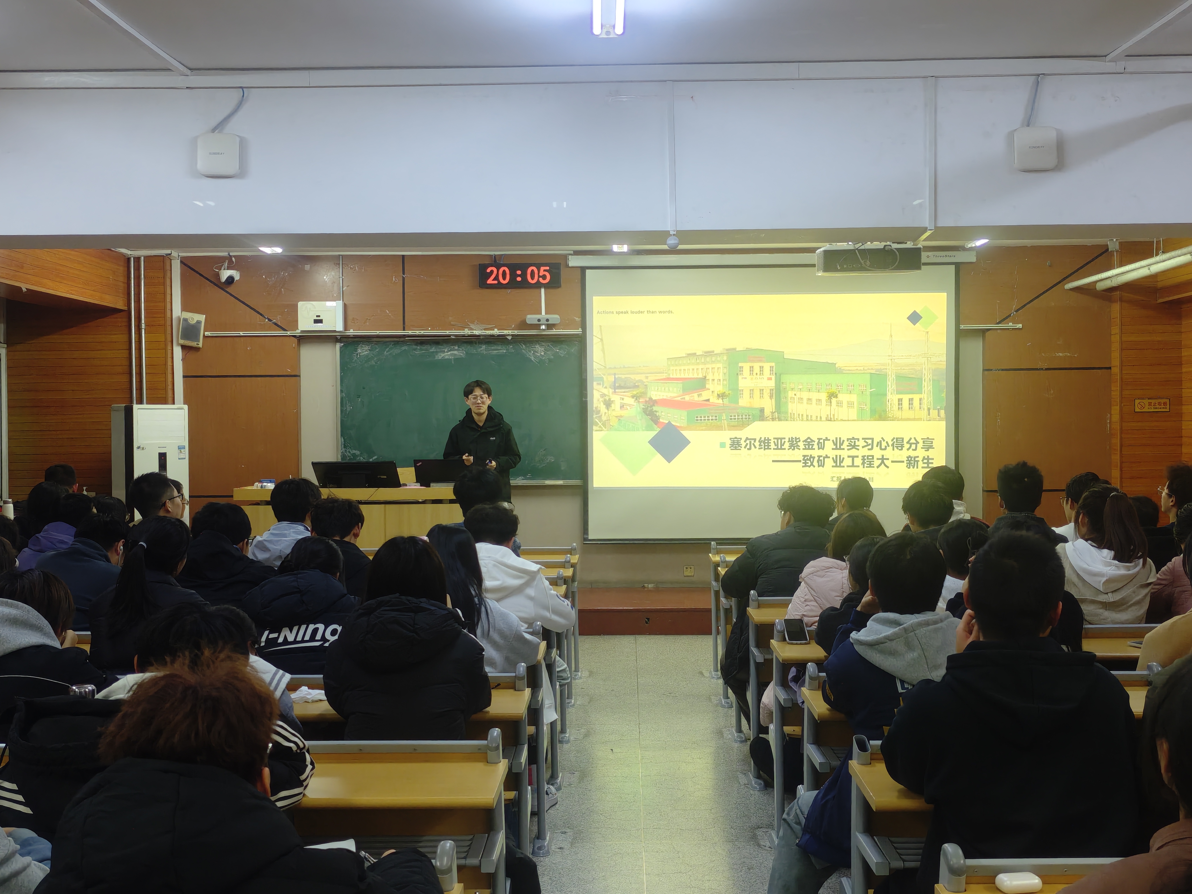 矿加242班沈小川以“行知世界-矿业工程员工赴塞尔维亚紫金矿业实习心得分享”为主题,从当地矿山工艺、人文风情讲到特色美食,以轻松幽默的语言描述了在异国实习的点点滴滴,他重点介绍了紫金矿业公司赴国外矿山工作员工的生活条件、休假制度、工资待遇和公司人文关怀等内容,极大激发了同学们对国际交流和毕业后赴国外矿山工作的热情。