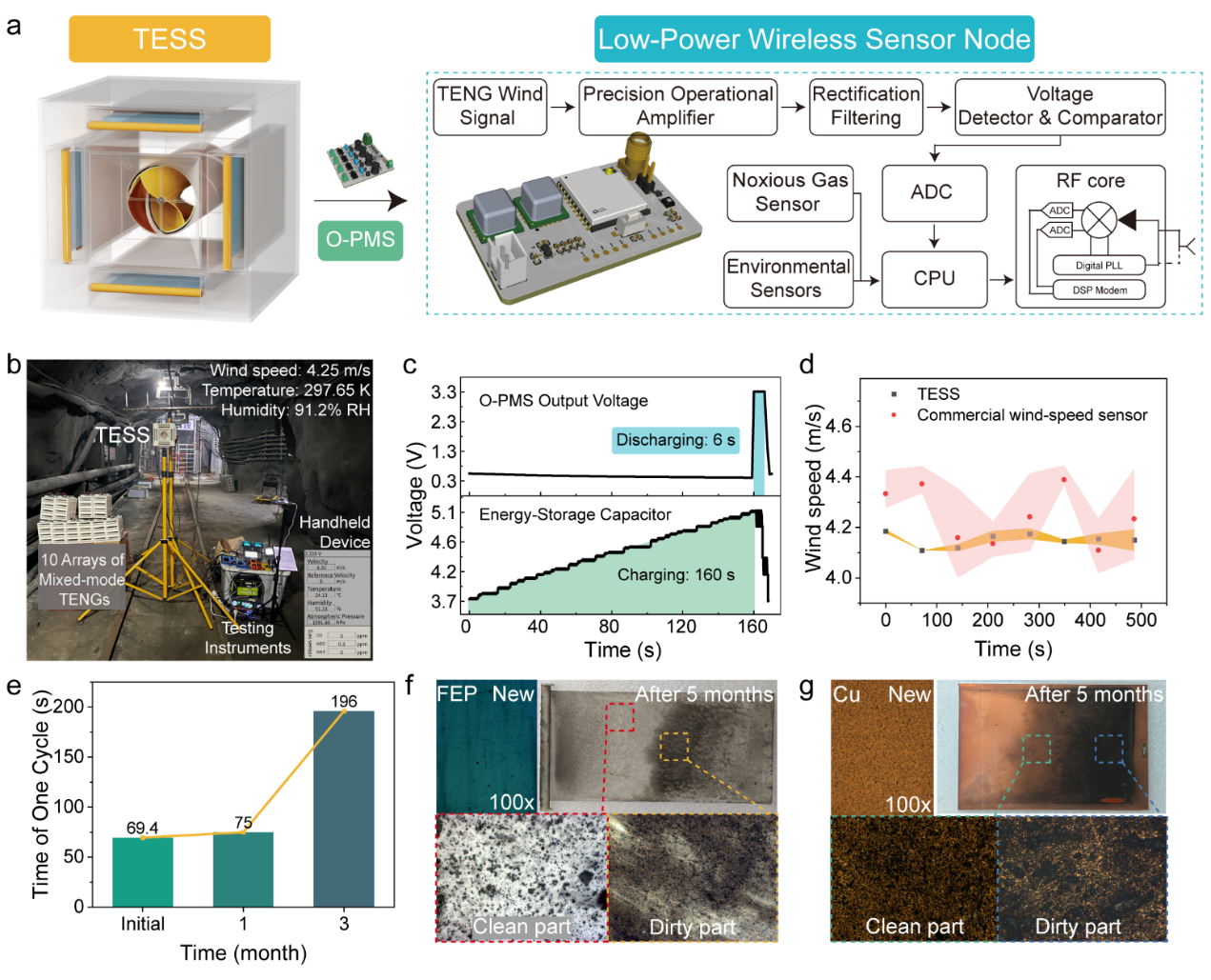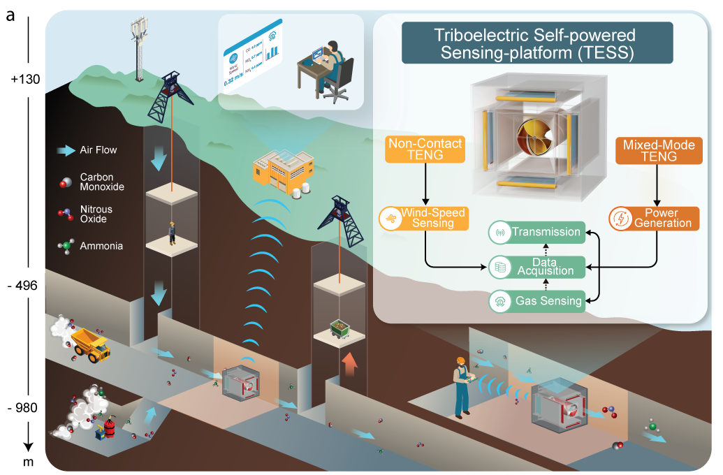 该研究构建了一种高度集成的摩擦纳米发电机自供能传感平台(TESS),通过风能收集-多参数感知-无线传输一体化架构,突破矿井监测领域长期存在的供能依赖与部署限制,可实现无人值守下的长期稳定运行。该平台具备可大规模部署、适应复杂环境的显著优势,有效提升了矿井实时监测的能力与系统运行的可靠性,为新一代智能矿山监测系统的技术原型提供了有力支撑。
