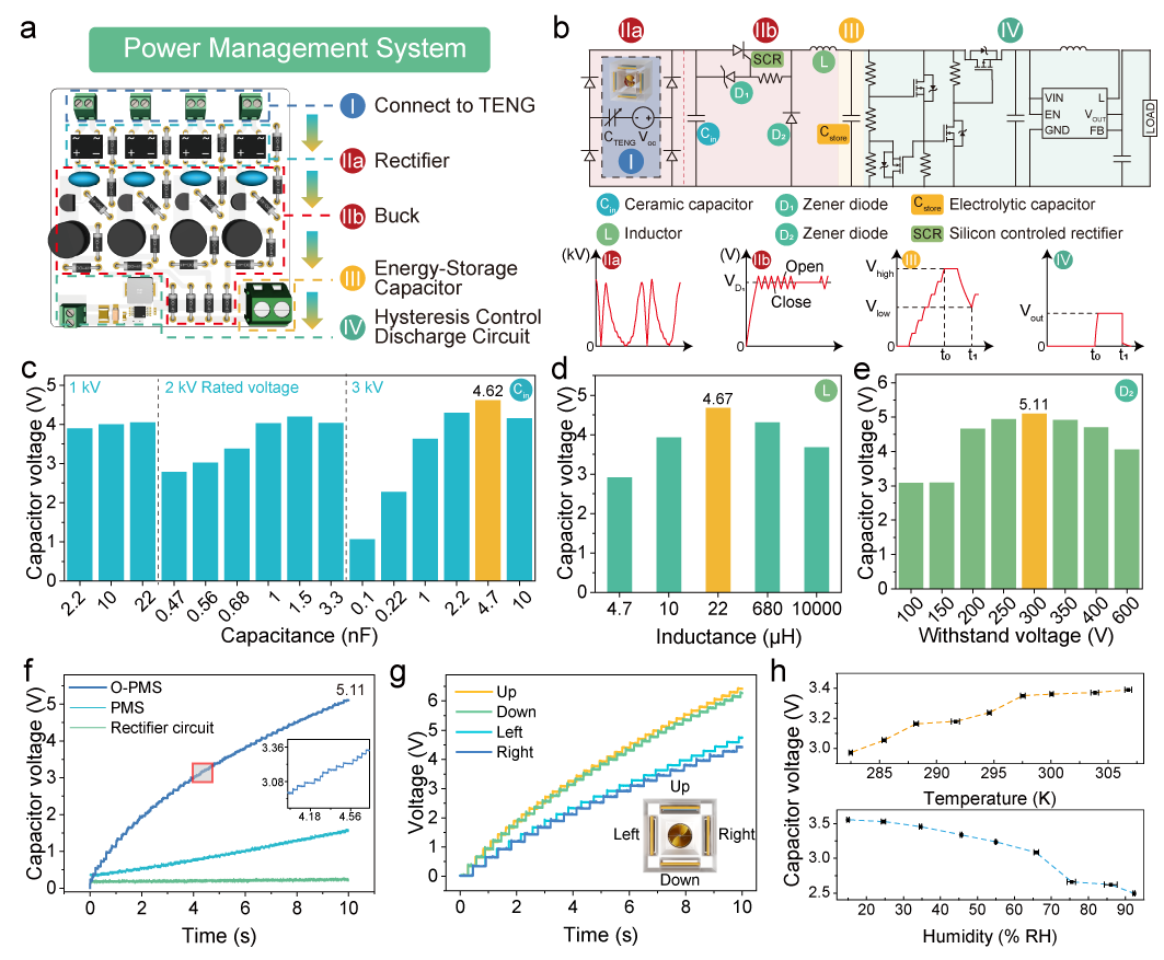 图2.适配混合模式TENG的能量管理系统(PMS)的原理和优化。a集成在TESS中的PMS的结构示意图。bPMS的工作原理。c-e储能电容Cₛₜₒᵣₑ的电压随c陶瓷电容Cin的电容值及其额定电压、d电感L的电感值以及e齐纳二极管D2的耐压值的变化。f使用整流桥、未优化的PMS及优化后的PMS (O-PMS)条件下,混合模式TENG在10 s内对470 μF的储能电容的充电曲线。g水平和垂直布设的混合模式TENG在10 s内对100 μF的储能电容的充电曲线。h温度和湿度对PMS能量转化效率的影响分析。