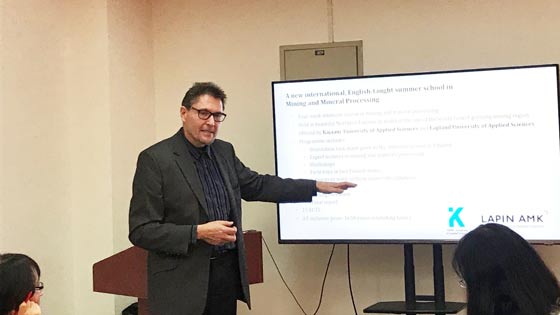 卡亚尼应用科技大学和拉普兰应用科技大学拟联合举办2019年矿业学科员工芬兰暑期夏令营,英文授课,为期四周,核心课题为智能采矿技术和矿业的安全生产与环境安全,包括专家讲座、研讨会、实验室实习和社会项目考察等内容。双方就通过矿业工程“暑期夏令营班”计划及方案,拓展员工视野及专业认知、密切双方合作交流达成了初步意向,争取促成“暑期夏令营班”成功举办。