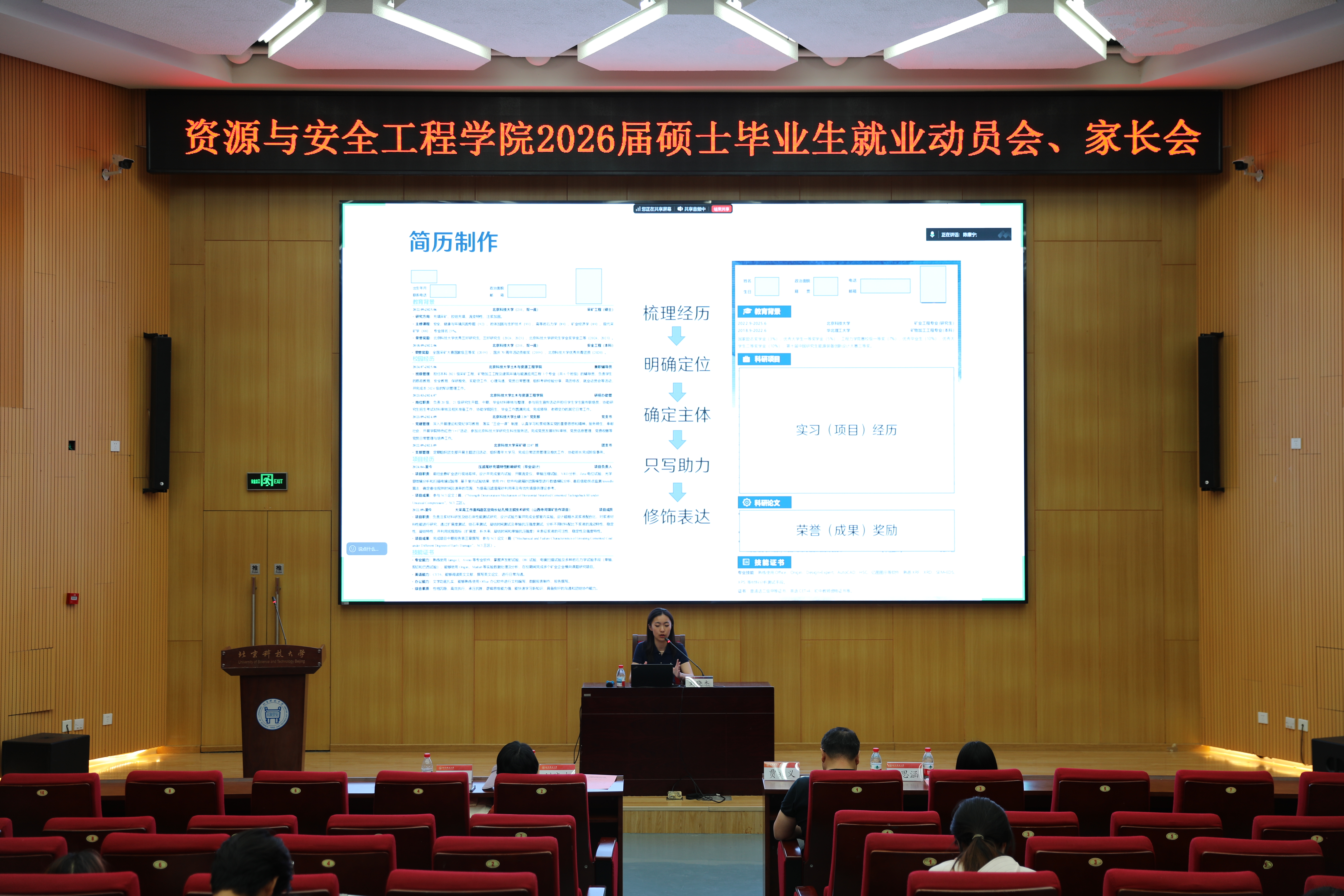 陈康宁为毕业生详细讲解了简历制作的要点和技巧,包括如何突出个人优势、如何呈现出一份有竞争力的简历等。她还结合实际案例,分析了常见的简历问题,让毕业生们对如何制作一份高质量的简历有了更直观的认识。