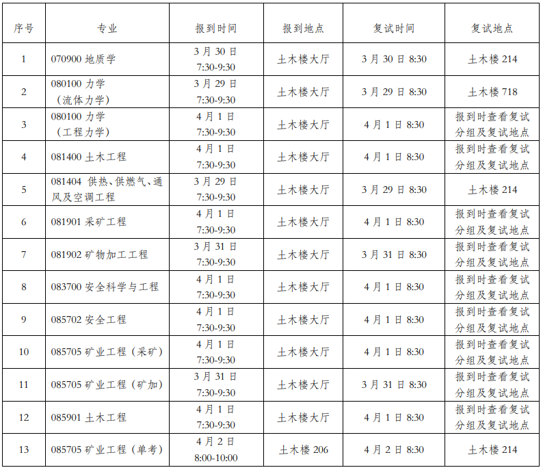 各专业一志愿考生报到、复试时间和地点