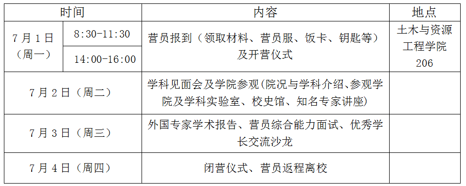 3. 公布录取名单:6月21日,组委会通过土木与资源工程学院网站(http://ces.ustb.edu.cn/)公布营员候选人。未入选者不再另行通知。