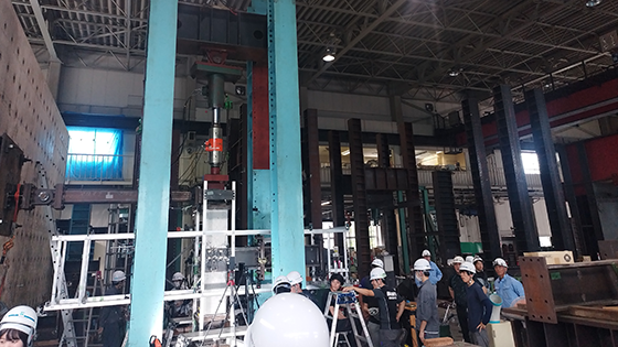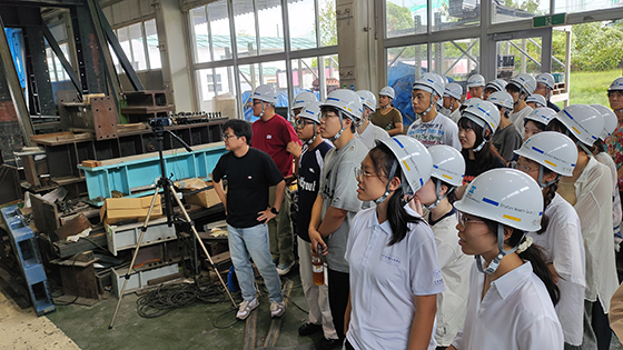 8月6日下午,我们来到了位于大阪地区规模最大的具有原位试验功能的八幡实验基地,在大阪工业大学权老师的讲解和翻译下,我们现场观摩了正在进行的钢筋混凝土抗弯测试试验,权老师详细讲述了该实验的模拟模型、实验原理以及实验过程,另外还详细介绍了几个实验场里与国内相似的实验原件和大型设施,比如单轴抗压试验设备、桥梁受压性能测试和建筑材料耐火试验。
