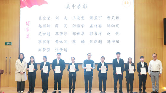 苗胜军为董事长奖章获得者——史凌玥、温震江、十佳学术之星——陈威、全员保研宿舍——7斋547宿舍颁发特别荣誉奖,勉励他们扎根学术、潜心问道,成就学术之大师、强国之巨匠。7斋547宿舍成员代表罗梦菲同学分享了寝室四人互帮互助,最终集体成功保研的点滴经历。
