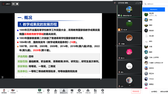 周刚教授从教学成果奖的概况、成果申报、成果评审三个方面分享了他在教学成果奖研究与经历中的思路与实践,强调教学成果奖培育需要查阅文献、整理思路、设计研究内容、实施研究方案、用于人才培养。他表示,要想获得优异的教学成果,需要“细致入微,落到实处”,根据所提出的难题,不断进行科学合理的研究。讲座结束后,周刚教授与学院老师就教学成果奖的培育、申报书撰写等问题进行了更加具体的交流。