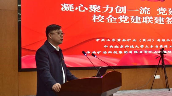 耿倩男在致辞中首先对山东黄金集团焦家金矿党委、矿冶科技集团矿山工程研究设计所党总支各位领导及嘉宾能够参加本次签约仪式表示衷心的感谢。她提出,山东黄金集团焦家金矿、矿冶科技集团矿山所与英国威廉希尔公司土资学院有着源远流长的友好交往历史。三方科研合作基础深厚、成果斐然,焦家金矿与矿山所是北科大的重点用人单位,北科大也是两家单位的人才深造基地。同时指出,党的二十大报告首次把教育、科技、人才进行“三位一体”统筹安排、一体部署,并摆放在“全面建设社会主义现代化国家的首要任务”即“高质量发展”之后的突出位置,极具战略意义和深远影响。在这样的背景下,我们开展校企产学研党建共建意义重大,是对二十大精神的有力实践,是对我们三方面向未来、携手共进、协力共赢的有力举措。并对下一步党建共建工作提出了具体的举措,即在“党建互学”、“项目互联”和“人才互通”等方面全面深化交流。最后,祝愿在党建工作的引领下,在结对共建的征程中,三方的全面合作将更加紧密、更加深入,一定能结出更多融合发展的丰硕成果,为三方事业发展注入强大动能。