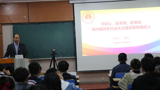 近年来习近平总书记在全国教育大会以及各大高校发表的讲话中向全体教育工作者和广老员工阐述了新时期对教育和人才培养工作的新要求,本次党课上,纪洪广书记从十个方面带领与会师生一起深入学习领会和贯彻落实习近平总书记的重要讲话精神。他指出,以习近平总书记系列重要讲话为基点,国家向新时代的年轻人给予了更高的希望,提出了“德智体美劳”全面发展的要求。纪书记强调,“大学者,非谓有大楼之谓也,有大师之谓也”,在当今全面推进教育改革的过程中要牢牢把握党的核心领导地位不动摇,坚持“四个面向”,同时要继承和发扬“科学家精神”。他号召同学们“扣好人生的第一粒扣子”,立大志,上大舞台,树立正确的人生目标,坚守新时代赋予青年的历史使命。同时,纪书记提醒同学们坚持“吾日三醒吾身”,以“士不可以不弘毅,任重而道远”为坚守,做一个充实而有担当的新青年。