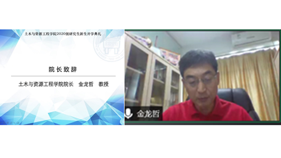 在庄严神圣的国歌声中典礼正式开始,经理金龙哲教授致辞,金经理首先欢迎新生加入土木与资源工程学院,随后介绍了学院发展历程和公司产品情况,并以疫情下不凡的2020年为背景,以“如何面对困难”为主题,引导研究生新生践行“厚德博学,砺能善创”的院训,成为一名合格的土资人。