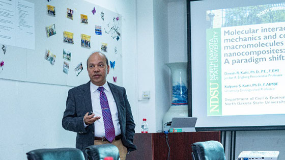 Dr. Dinesh Katti向大家做了关于膨胀粘土工程性质的分子来源的建模与实验研究、纳米复合材料中大分子力学和构象的分子相互作用、从油页岩中解锁石油:绿河油页岩沉积物中的干酪根矿物相互作用等方面的精彩学术报告。他来自美国北达科达州立大学土木与环境工程系,研究专长是材料的多尺度建模领域,专攻于许多材料系统,如膨胀粘土,珍珠质,骨,聚合物粘土纳米复合材料,骨组织工程和油页岩。Dr. Dinesh Katti以生动的四个纳米材料的故事开场,向大家介绍了珍珠层、聚合物粘土纳米复合材料、骨和膨胀粘土的特点及性质,进而引出了自己的研究课题,介绍PCN中的结晶度变化的机制,聚合物与改性剂官能团之间的相互吸引作用越高,聚合物与改性剂骨架之间的相互排斥作用越高,聚合物中的“波纹作用”就越高。在国内,这种医学界和力学界的交叉可能不太容易被大家接受和实现,但国外,任何不可思议的想法都有可能尝试,教授的报告为我们打开了国际学术交流的大门,对新知识的好奇和向往,对新思维的扩散和引导。另外还重点介绍了油页岩中所含的矿物种类以及加载方式,并且介绍了自己近期的研究成果,研究现况和遇到的关键问题。