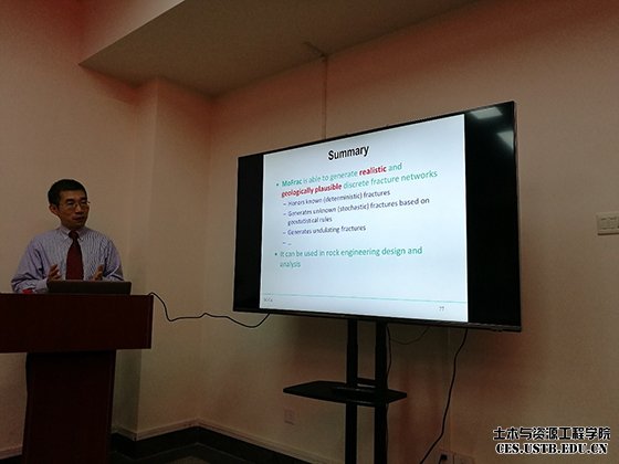 11月23日下午,蔡教授在土环楼214会议室做学术报告,报告主题为“Advanced Discrete Fracture Network Modeling using MoFrac”,由安全科学与工程系何学秋教授主持,安全系部分师生和其他院校的几位老师到场聆听报告。