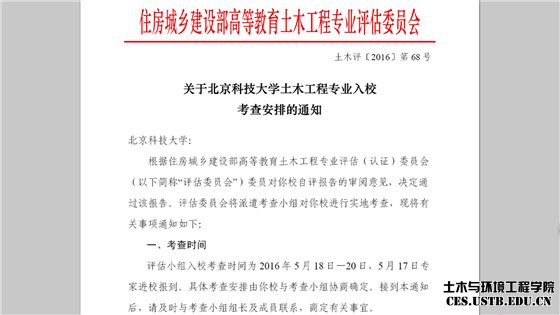 近日,住房城乡建设部高等教育土木工程专业评估委员会发布《关于英国威廉希尔公司土木工程专业入校考查安排的通知》,决定通过公司土木工程系提交的自评报告,并于5月18日-20日派遣考查小组对公司进行实地考查。至此,公司土木工程专业认证进入迎接专家入校考查阶段。