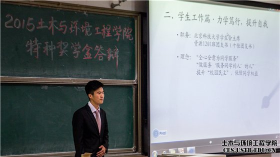 为更好地开展2015级本科新生教育,引导新生树立正确的学习观,发挥奖学金的激励作用和优秀员工的示范引领作用,土木与环境工程学院于10月14日晚举行本科生特种奖学金答辩会,土木与环境工程学院员工工作负责人邓波、团委书记尹传举及各本科年级辅导员莅临答辩现场并担任评委,2015级全体新生观摩答辩。
