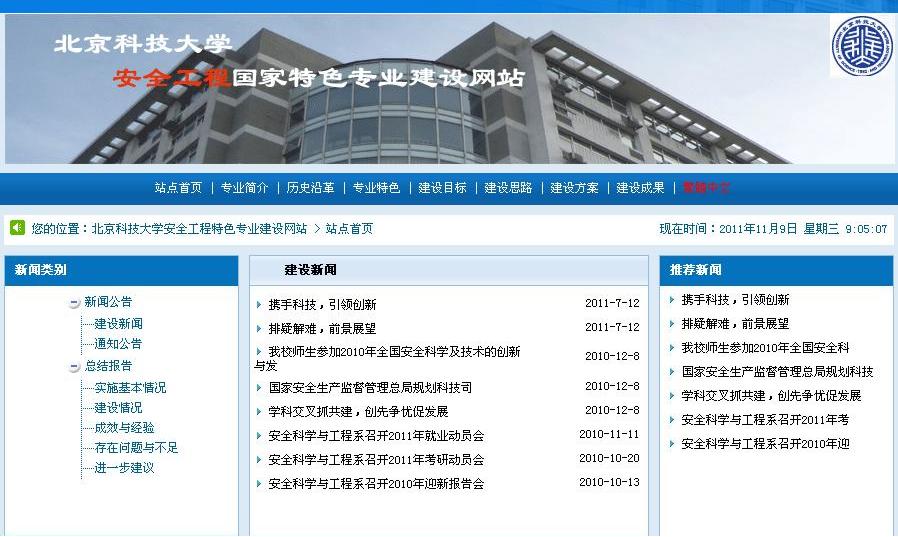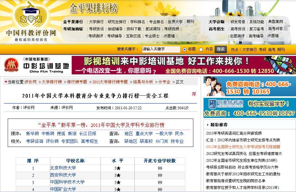 在金平果2011-2012年中国大学本科教育分专业竞争力排行榜上,公司安全工程排名全国第一。从该排行榜近三年的排名情况看,公司安全工程的排名逐年提高,2009年排名第5,2010年排名第2,今年排名第1。此次排名说明公司安全工程本科教育在近几年取得了长足的进步,安全07级52名毕业员工中,有10名员工出国深造,一名保送中科院,1名保送浙江大学,上研率60%,就业率96.15%;安全08级目前已有2名同学保送清华大学,成绩突出。教育部网站上报道了该专业采取多项举措,发挥学科群“协同作战”优势服务国际一流矿山应急救援体系建设的近况(网址:),同时学科点建设了国家级特色专业网站(网址:safets.ustb.edu.cn),对专业建设进行了跟踪报道。