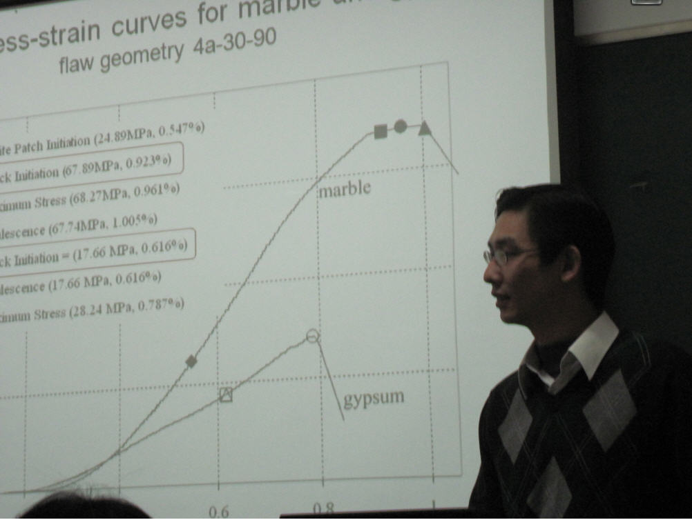报告会上王教授详细介绍了含预制裂纹岩石材料和类似岩石材料试样中裂纹起裂和发展的研究经历和成果。通过高速摄像技术,观察单轴加载条件下,预制裂纹周围裂纹起裂、延展乃至最后的贯通过程。通过对实验结果基于裂纹发展模式和裂纹迹线的分析,对其中不同的裂纹类型进行详细的区分与归纳,并使用SEM(scanning electron microprobe)和ESEM(environmental scanning electron microprobe)技术,对大理石试样中张拉裂纹出现前的白色斑迹以及石膏中宏观裂纹出现的发线裂纹进行观察和比较。