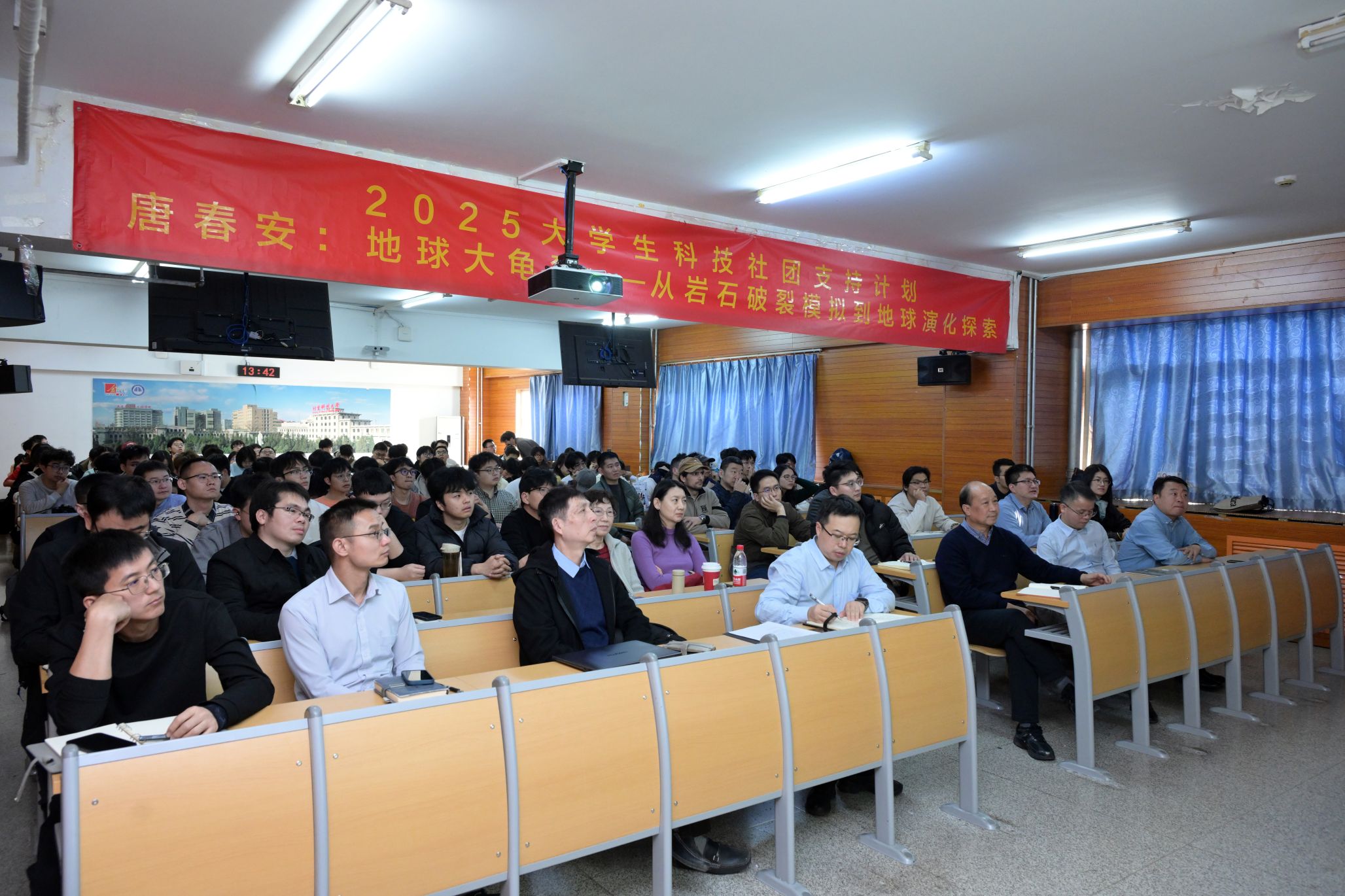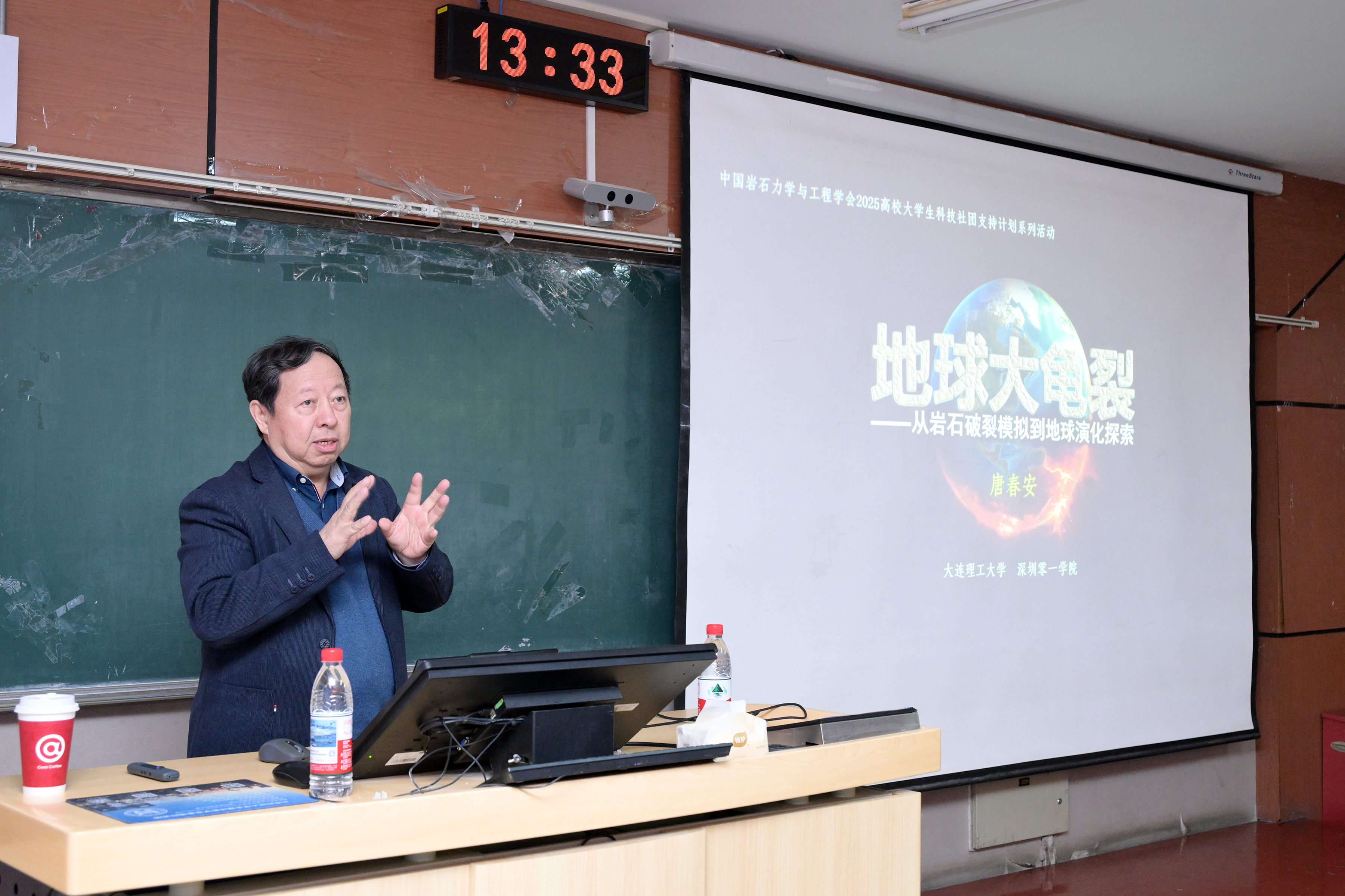 讲座中,唐春安基于热力学、物理学和力学的基本原理,从龟裂的形成机理入手,详细阐述了“地球大龟裂”理论。将“龟裂现象”置于自然科学的底层逻辑中进行剖析。互动环节中,师生围绕关于地球演化、岩石破裂模拟等问题展开热烈讨论。唐春安以自身科研实践为例,勉励青年学子要敢于“打破学科壁垒,用融合视角攻克地学难题”。